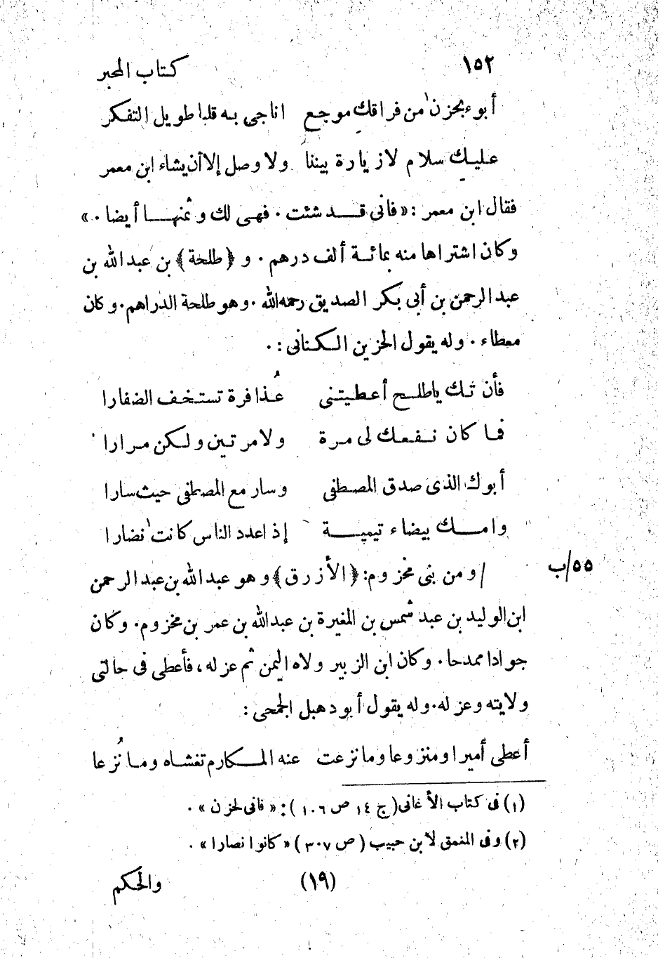 فقال ابن معمر: «فاني قد شئت. فهي لك وثمنها أيضا.» وكان اشتراها منه بمائة ألف درهم. و (طلحة) بن عبد الله بن عبد الرحمن بن أبى بكر الصديق رحمه الله. وهو طلحه الدراهم. وكان معطاء. وله يقول الحزين الكناني:.
