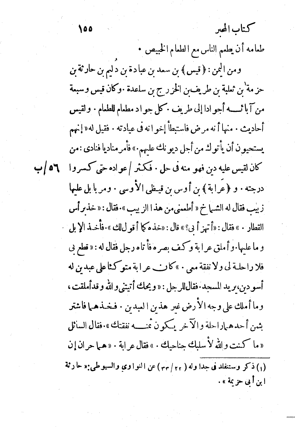 ومن اليمن: (قيس) بن سعد بن عبادة بن دليم بن حارثة بن حزمة [1] بن ثعلبة بن طريف بن الخزرج بن ساعدة. وكان قيس وسبعة من آبائه أجوادا إلى طريف. كل جواد مطعام للطعام. ولقيس أحاديث. منها أنه مرض فاستبطأ إخوانه في عيادته. فقيل له «إنهم يستحيون أن يأتوك من أجل ديونك عليهم.» فأمر مناديا فنادى: من كان لقيس عليه دين فهو منه في حل. فكثر/ عواده حتى كسروا درجته. و (عرابة) بن أوس بن قيظى الأوسى. ومر بابل عليها زبيب فقال له الشماخ «أطعمني من هذا الزبيب» . فقال: «خذ برأس القطار.» فقال: «أتهز أبى؟» قال: «خذه كما أقول لك» . فأخذ الإبل وما عليها. وأملق عرابة وكف بصره فأتاه رجل فقال له: «قطع بى فلا راحلة لى ولا نفقة معى.» كان عرابة متوكئا على عبدين له أسودين، يريد المسجد. فقال للرجل: «ويحك أتيتني والله وقد أملقت، وما أملك على وجه الأرض غير هذين العبدين. فخذهما فاشتر بثمن أحدهما راحلة والآخر يكون ثمنه نفقتك» . فقال السائل «ما كنت والله لأسلبك جناحيك.» فقال عرابة. «هما حران إن