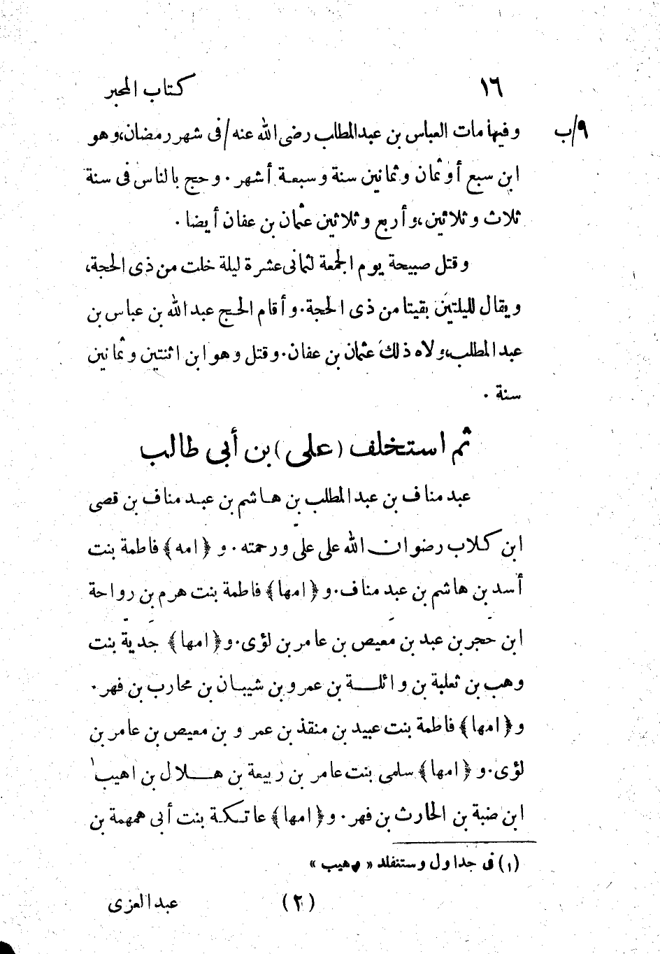عبد مناف بن عبد المطلب بن هاشم بن عبد مناف بن قصى ابن كلاب رضوان الله علي علي ورحمته. و (أمه) فاطمة بنت أسد بن هاشم بن عبد مناف. و (أمها) فاطمة بنت هرم بن رواحة ابن حجر بن عبد بن مَعيص بن عامر بن لؤي. و (أمها) جدية بنت وهب بن ثعلبة بن وائلة بن عمرو بن شيبان بن محارب بن فهر.