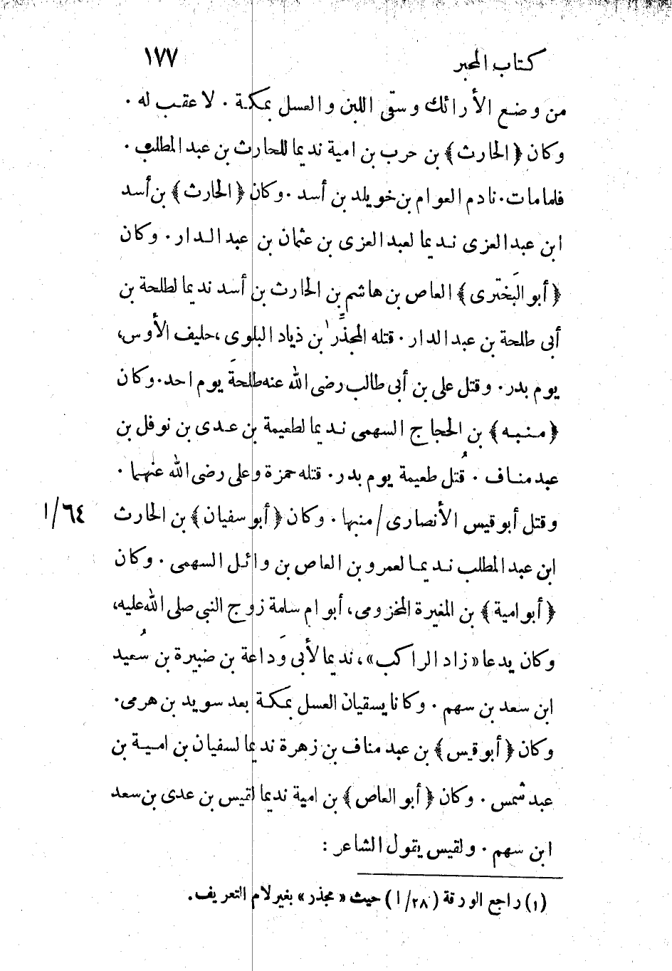 فلما مات. نادم العوام بن خويلد بن أسد. وكان (الحارث) بن أسد ابن عبد العزى نديما لعبد العزي بن عثمان بن عبد الدار. وكان (أبو البختري) العاص بن هاشم بن الحارث بن أسد نديما لطلحة بن أبي طلحة بن عبد الدار. قتله المجذر [1] بن ذياد البلوي، حليف الأوس، يوم بدر. وقتل علي بن أبي طالب رضي الله عنه طلحةَ يوم احد. وكان (منبه) بن الحجاج السهمي نديما لطعيمة بن عدي بن نوفل بن عبد مناف. قُتل طعيمة يوم بدر. قتله حمزة وعلي رضى الله عنهما.