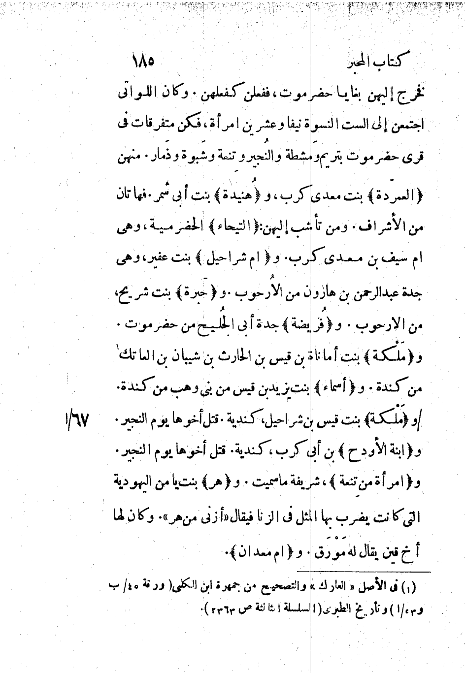 فخرج إليهن بغايا حضرموت، ففعلن كفعلهن. وكان اللواتي اجتمعن إلى الست النسوِة نيفا وعشرين امرأة، فكن متفرقات في قرى حضرموت بتريم ومَشطة والنُجير وتنعة وشبوة وذمار. منهن (العمرّدة) بنت معدى كرب، و (هنيدة) بنت أبي شمر. فهاتان من الأشراف. ومن تأشب إليهن: (التيحاء) الحضرمية، وهي ام سيف بن معدى كرب. و (ام شراحيل) بنت عفير، وهي جدة عبد الرحمن بن هارون من الارحوب. و (حبرة) بنت شريح، من الارحوب. و (فريضة) جدة أبى الجليح من حضرموت.