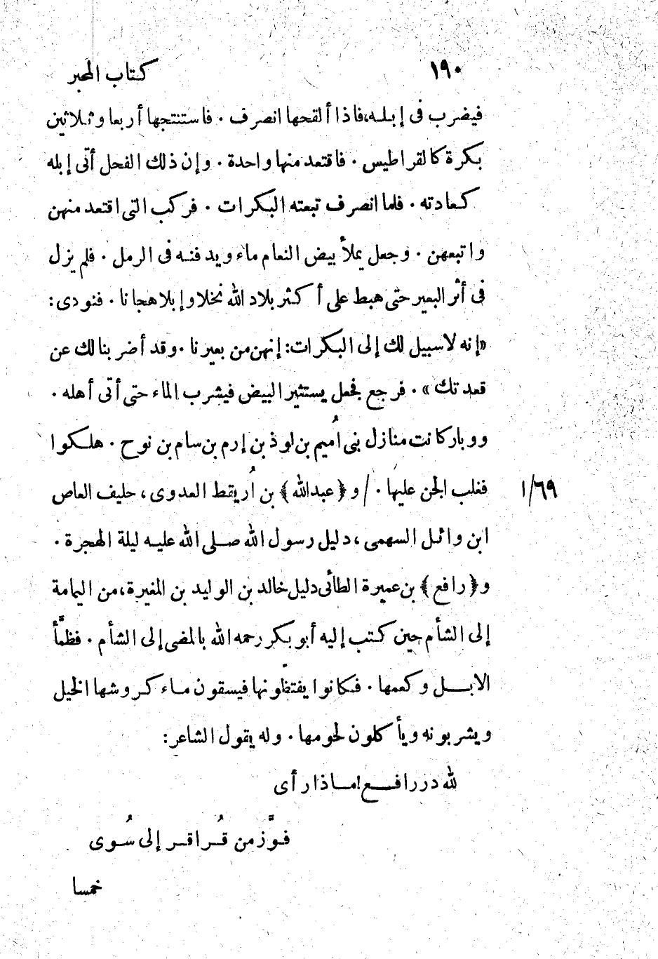 فيضرب في إبله، فاذا ألقحها انصرف. فاستنتجها أربعا وثلاثين بكرة كالقراطيس. فاقتعد منها واحدة. وإن ذلك الفحل أتى إبله كعادته. فلما انصرف تبعته البكرات. فركب التي اقتعد منهن واتبعهن. وجعل يملأ بيض النعام ماء ويدفنه في الرمل. فلم يزل فى أثر البعير حتى هبط على أكثر بلاد الله نخلا وإبلا هجانا. فنودي: