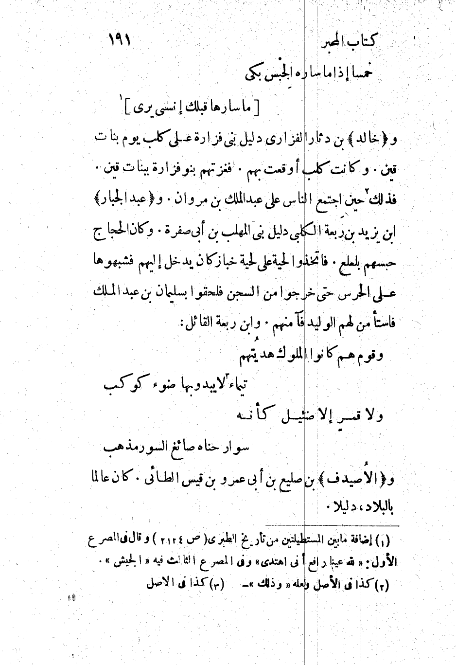 فذلك [2] حين اجتمع الناس على عبد الملك بن مروان. و (عبد الجبار) ابن يزيد بن رَبعة الكلبي دليل بني المهلب بن أبى صفرة. وكان الحجاج حبسهم بلعلع. فاتخذوا لحية على لحية خباز كان يدخل إليهم فشبهوها على الحرس حتى خرجوا من السجن فلحقوا بسليمان بن عبد الملك فاستأمن لهم الوليد فآمنهم. وابن ربعة القائل: