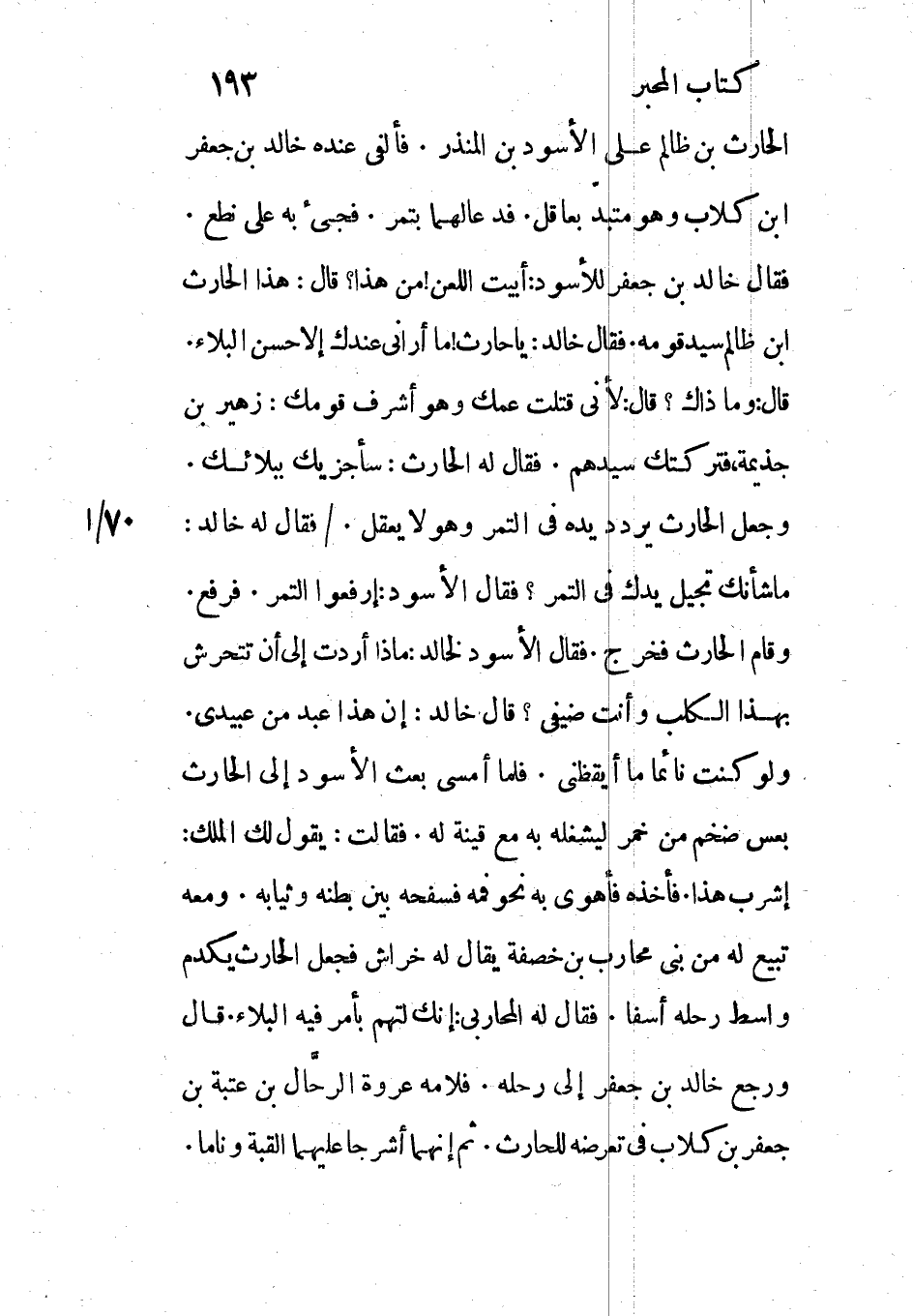 اشرب هذا. فأخذه فأهوى به نحو فمه فسفحه بين بطنه وثيابه. ومعه تبيع له من بنى محارب بن خصفة يقال له خراش فجعل الحارث يكدم واسط رحله أسفا. فقال له المحاربي: إنك لتهم بأمر فيه البلاء. قال ورجع خالد بن جعفر إلى رحله. فلامه عروة الرحّال بن عتبة بن جعفر بن كلاب في تعرضه للحارث. ثم إنهما أشرجا عليهما القبة وناما.