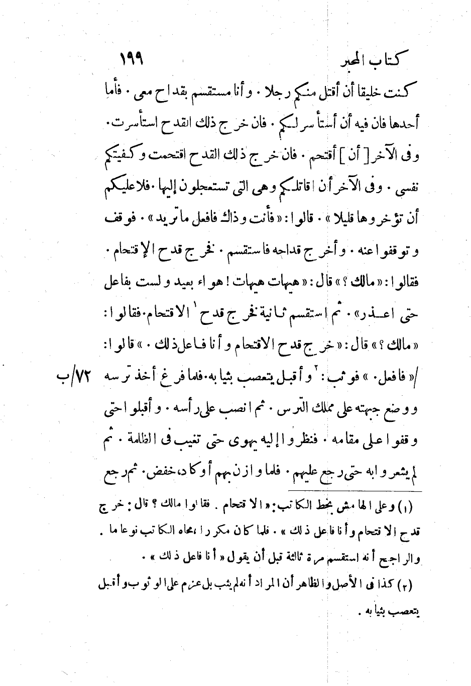 [1] وعلى الهامش بخط الكاتب: «الاقتحام. فقالوا مالك؟ قال: خرج قدح الاقتحام وأنا فاعل ذلك» . فلما كان مكررا، محاه الكاتب نوعا ما.