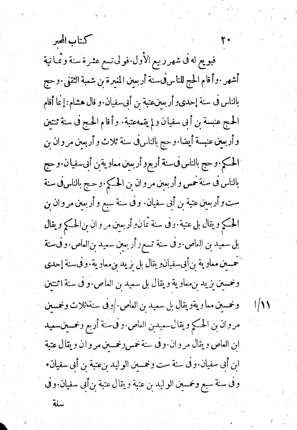 فبويع له فى شهر ربيع الأول. فولى تسع عشرة سنة وثمانية أشهر. وأقام الحج للناس في سنة أربعين المغيرة بن شعبة الثقفي. وحج بالناس في سنة احدى وأربعين عتبة بن أبي سفيان. وقال هشام: إنما أقام الحج عنبسة بن أبي سفيان ولم يقمه عتبة. وأقام الحج في سنة ثنتين وأربعين عنبسة أيضاً. وحج بالناس في سنة ثلاث وأربعين مروان بن الحكم. وحج بالناس في سنة أربع وأربعين معاوية بن أبي سفيان. وحج بالناس في سنة خمس وأربعين مروان بن الحكم. وحج بالناس في سنة ست وأربعين عتبة بن أبي سفيان. وفى سنة سبع وأربعين مروان بن الحكم ويقال بل عتبة. وفي سنة ثمان وأربعين مروان بن الحكم ويقال بل سعيد بن العاص. وفي سنة تسع وأربعين سعيد بن العاص. وفي سنة خمسين معاوية بن أبي سفيان ويقال بل يزيد بن معاوية. وفي سنة احدى وخمسين يزيد بن معاوية ويقال بل سعيد بن العاص. وفي سنة اثنتين وخمسين معاوية ويقال بل سعيد بن العاص. / وفي سنة ثلاث وخمسين مروان بن الحكم ويقال سعيد بن العاص. وفي سنة أربع وخمسين سعيد ابن العاص ويقال مروان. وفي سنة خمس وخمسين مروان ويقال عتبة ابن أبي سفيان. وفي سنة ست وخمسين الوليد بن عتبة بن أبي سفيان.