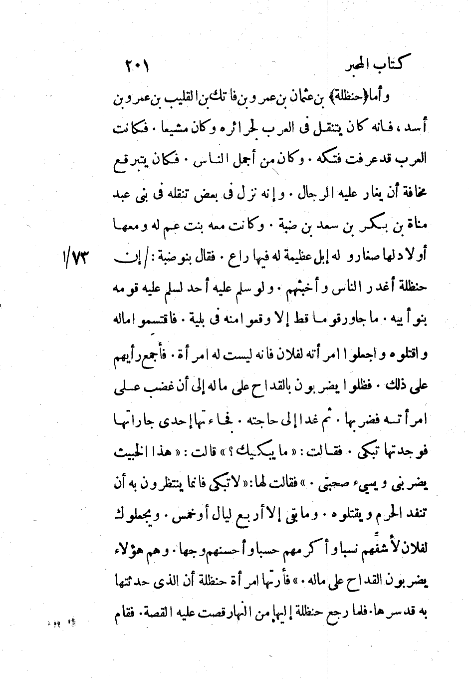 وأما (حنظلة) بن عثمان بن عمرو بن فاتك بن القليب بن عمرو بن أسد، فانه كان يتنقل في العرب لجرائره وكان مشيعا. فكانت العرب قد عرفت فتكه. وكان من أجمل الناس. فكان يتبرقع مخافة أن يغار عليه الرجال. وإنه نزل في بعض تنقله في بني عبد مناة بن بكر بن سعد بن ضبة. وكانت معه بنت عم له ومعها أولاد لها صغار وله إبل عظيمة له فيها راع. فقال بنو ضبة: / إن حنظلة أغدر الناس وأخبثهم. ولو سلم عليه أحد لسلم عليه قومه بنو أبيه. ما جاور قوما قط إلا وقعوا منه فى بلية. فاقتسموا ماله واقتلوه واجعلوا امرأته لفلان فانه ليست له امرأة. فأجمع رأيهم على ذلك. فظلوا يضربون بالقداح على ماله إلى أن غضب على امرأته فضربها. ثم غدا إلى حاجته. فجاءتها إحدى جاراتها فوجدتها تبكي. فقالت: «ما يبكيك؟» قالت: «هذا الخبيث يضربني ويسيء صحبتي.» فقالت لها: «لا تبكى فانما ينتظرون به أن تنفد الحرم ويقتلوه. وما بقي إلا أربع ليال أو خمس. ويجعلوك لفلان لأشفّهم نسبا وأكرمهم حسبا وأحسنهم وجها. وهم هؤلاء يضربون القداح على ماله.» فأرتها أمرأة حنظلة أن الذي حدثتها به قد سرها. فلما رجع حنظلة إليها من النهار قصت عليه القصة. فقام