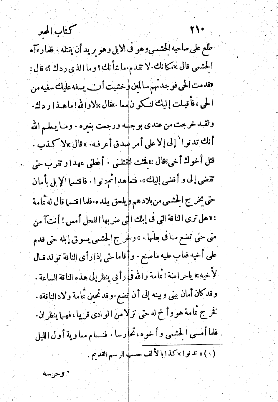 قتل أخوك أخي» قال: «فجئت لتقتلني. أعطني عهدا وتقرب حتى تقضي إلى وأقضي إليك» . فتعاهدا ثم دنوا. فاقتسما الإبل بأمان حتى يخرج الجشمي من بلادهم ويلحق ببلده. فلما اقتسما قال له ثمامة: «هل ترى الناقة التي في إبلك التي ضربها الفحل أمس؟ أنت آمن مني حتى تضع ما في بطنها.» وخرج الجشمي يسوق إبله حتى قدم على أخيه فعاب عليه ما صنع. وأقاما حتى إذا رأى الناقة تولد قال لأخيه: «يا حراضة! ثمامة والله فى رأيى ينظر إلى هذه الناقة الساعة.