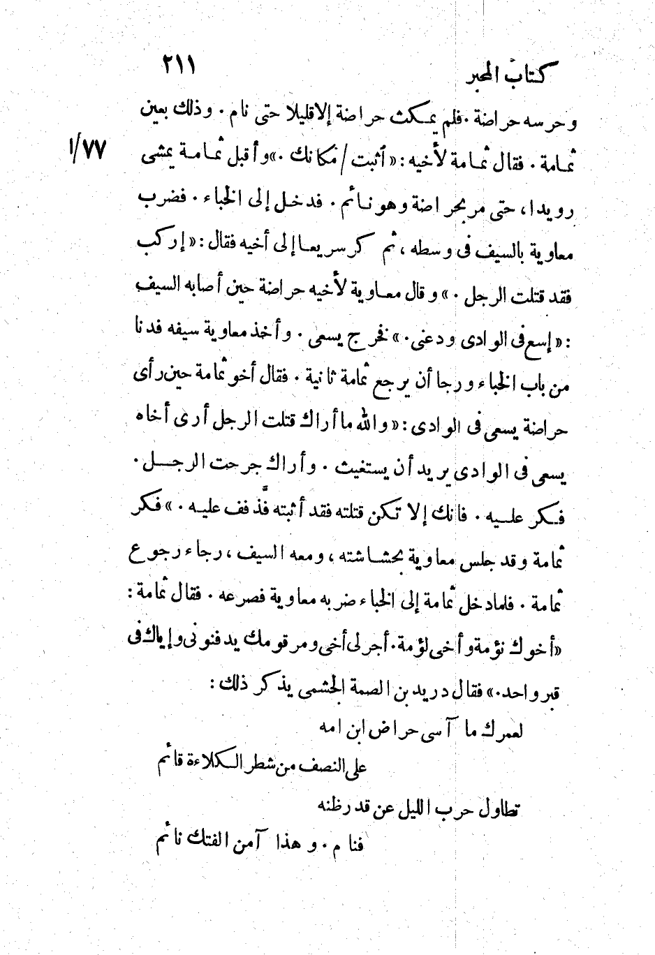 وحرسه حراضة. فلم يمكث حراضة إلا قليلا حتى نام. وذلك بعين ثمامة. فقال ثمامة لأخيه: «أُثبت/ مكانك.» وأقبل ثمامة يمشي رويدا، حتى مر بحراضة وهو نائم. فدخل إلى الخباء. فضرب معاوية بالسيف في وسطه، ثم كر سريعا إلى أخيه فقال: «اركب فقد قتلت الرجل.» وقال معاوية لأخيه حراضة حين أصابه السيف: «إسع في الوادي ودعني.» فخرج يسعى. وأخذ معاوية سيفه فدنا من باب الخباء ورجا أن يرجع ثمامة ثانية. فقال أخو ثمامة حين رأى حراضة يسعى في الوادي: «والله ما أراك قتلت الرجل أرى أخاه يسعى فى الوادي يريد أن يستغيث. وأراك قتلت الرجل أرى أخاه يسعى في الوادي يريد أن يستغيث. وأراك جرحت الرجل.