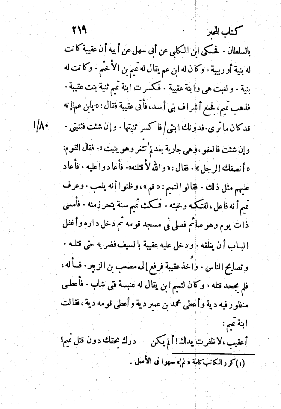 بالسلطان. فحكى ابن الكلبي عن ابي سهل عن أبيه أن عقيبة كانت له بنية أو ربيبة. وكان له ابن عم يقال له تميم بن الأخثم. وكانت له بنية. ولعبت هي وابنة عقيبة. فكسرت ابنة تميم ثنية بنت عقيبة.