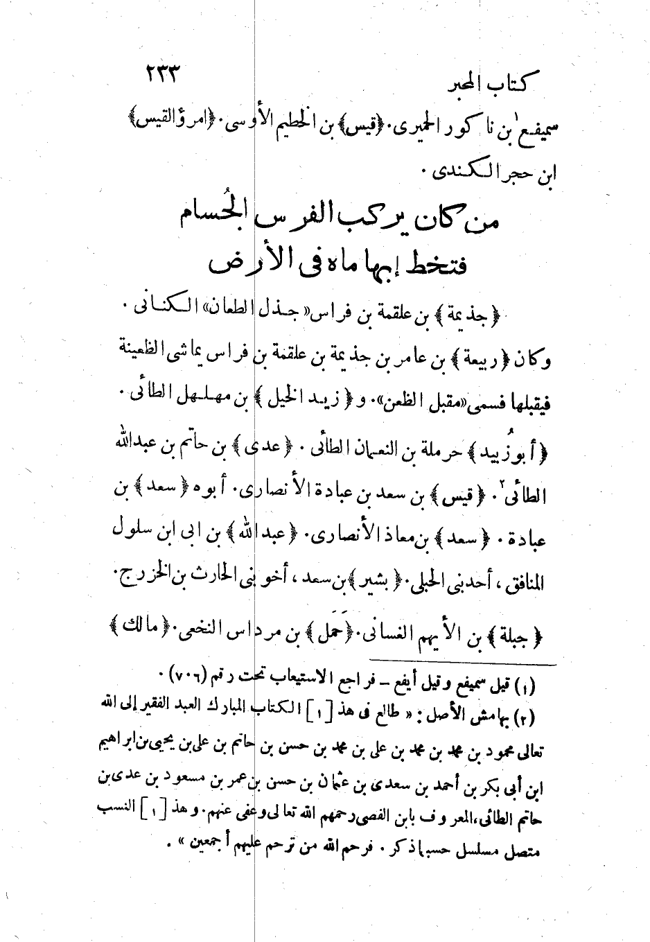 [2] بهامش الأصل: «طالع فى هذ [1] الكتاب المبارك العبد الفقير إلى الله تعالى محمود بن محمد بن محمد بن على بن محمد بن حسن بن حاتم بن على بن يحيى بن ابراهيم ابن أبى بكر بن أحمد بن سعدى بن عثمان بن حسن بن عمر بن مسعود بن عدى بن حاتم الطائي، المعروف بابن الفصى رحمهم الله تعالى وعفى عنهم. وهذا [1] النسب متصل مسلسل حسبما ذكر. فرحم الله من ترحم عليهم أجمعين» .