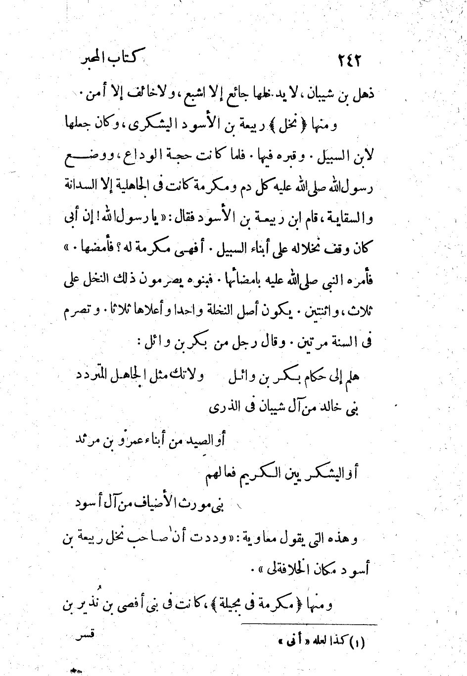 ومنها (نخل) ربيعة بن الأسود اليشكري، وكان جعلها لابن السبيل. وقبره فيها. فلما كانت حجة الوداع، ووضع رسول الله صلى الله عليه كل دم ومكرمة كانت فى الجاهلية إلا السدانة والسقاية، قام ابن ربيعة بن الأسود فقال: «يا رسول الله! إن أبي كان وقف نخلا له على أبناء السبيل. أفهي مكرمة له؟ فأمضها.» فأمره النبي صلى الله عليه بامضائها. فبنوه يصرمون ذلك النخل على ثلاث، واثنتين. يكون أصل النخلة واحدا وأعلاها ثلاثا. وتصرم في السنة مرتين. وقال رجل من بكر بن وائل: