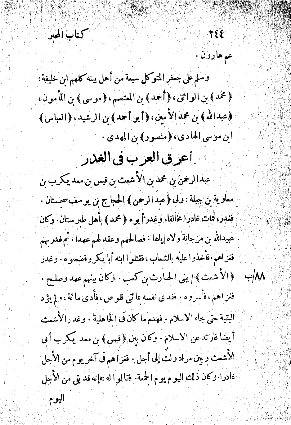 فغدر، فمات غادرا مخالفا. وغدر أبوه (محمد) بأهل طبرستان. وكان عبيد الله بن مرجانة ولاه إياها. فصالحهم وعقد لهم عهدا. ثم غدر بهم فغزاهم. فأخذوا عليه بالشعاب، فقتلوا ابنه أبا بكر وفضحوه. وغدر (الأشعث) / ببني الحارث بن كعب. وكان بينهم عهد وصلح.