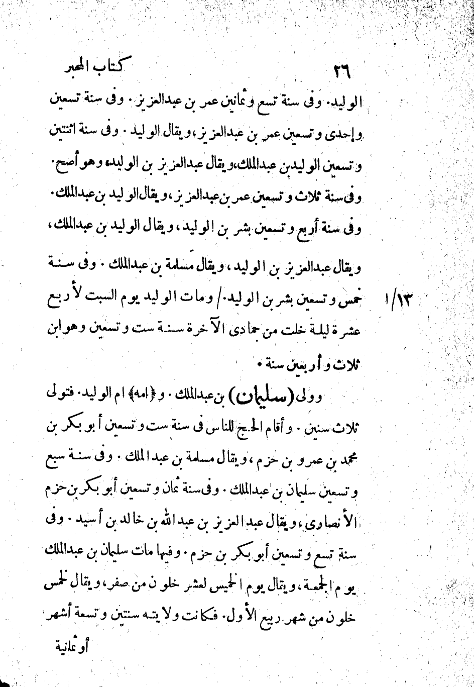 وفي سنة أربع وتسعين بشر بن الوليد، ويقال الوليد بن عبد الملك، ويقال عبد العزيز بن الوليد، ويقال مَسلمة بن عبد الملك. وفي سنة خمس وتسعين بشر بن الوليد. / ومات الوليد يوم السبت لأربع عشرة ليلة خلت من جمادى الآخرة سنة ست وتسعين وهو ابن ثلاث وأربعين سنة.
