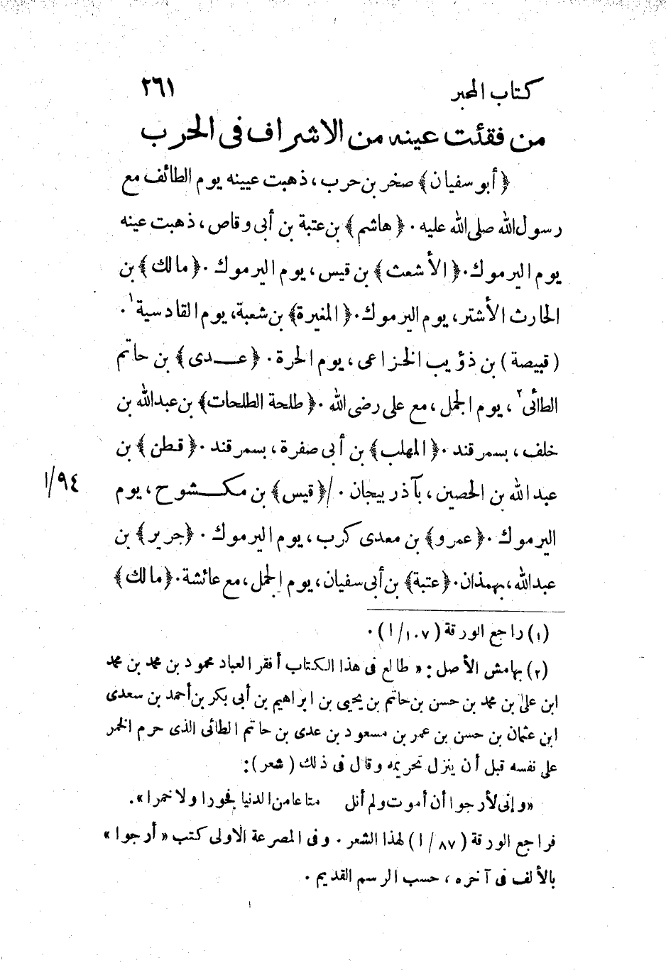 (أبو سفيان) صخر بن حرب، ذهبت عيينه يوم الطائف مع رسول الله صلى الله عليه. (هاشم) بن عتبة بن أبي وقاص، ذهبت عينه يوم اليرموك. (الأشعث) بن قيس، يوم اليرموك. (مالك) بن الحارث الأشتر، يوم إليرموك. (المغيرة) بن شعبة، يوم القادسية [1] .