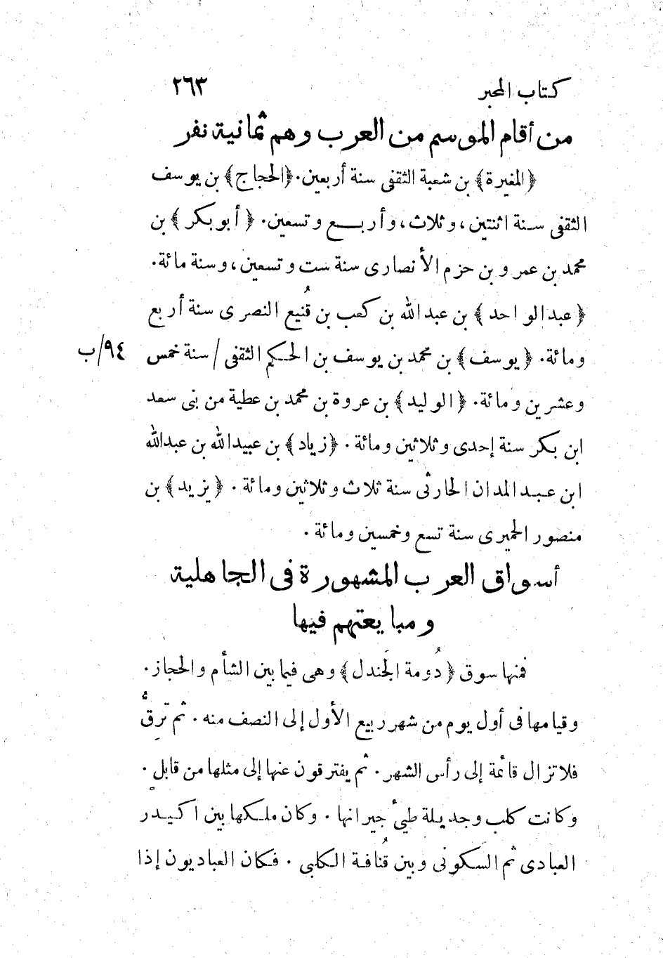 (المغيرة) بن شعبة الثقفي سنة اربعين. (الحجاج) بن يوسف الثقفي سنة اثنتين، وثلاث، وأربع وسبعين. (أبو بكر) بن محمد بن عمرو بن حزم الأنصاري سنة ست وتسعين، وسنة مائة.