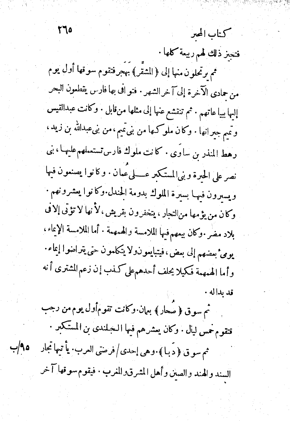 [1] إذا كانت سوق المشقر تقوم الى آخر جمادى الاخر، كما ذكر آنفا، فالأصوب ما قال المرزوق (فى الازمنة والامكنة، ج 2، ص 163) عن ابن الكلبي: انهم يرتحلون من المشقر الى صحار أول يوم من رجب فيقدمون لعشرين يوما تمضى من رجب ويبيعون بها خمسا.