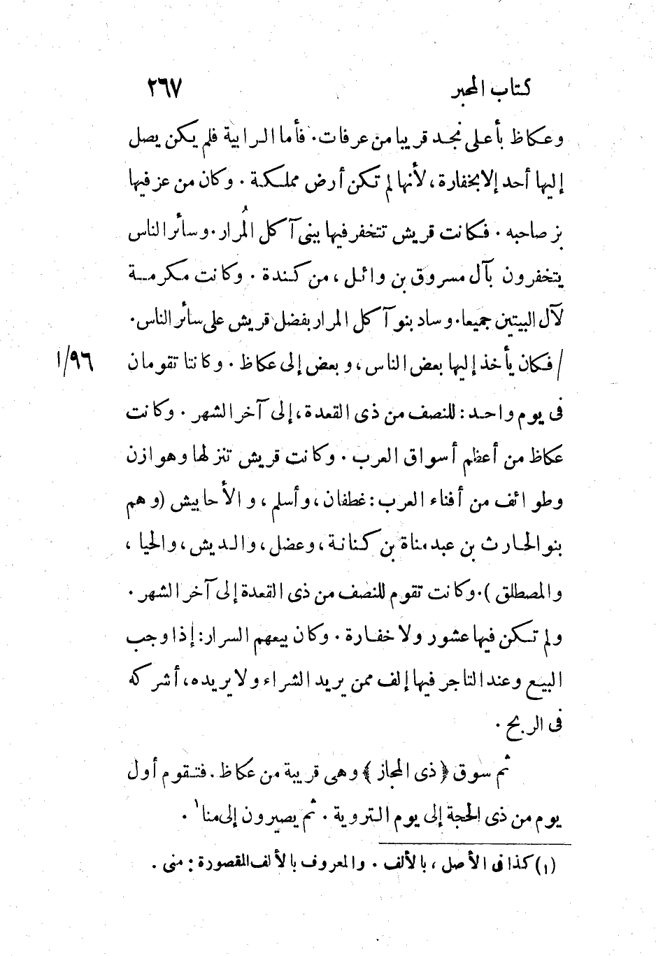 / فكان يأخذ إليها بعض الناس، وبعض إلى عكاظ. وكانتا تقومان في يوم واحد: للنصف من ذي القعدة، إلى آخر الشهر. وكانت عكاظ من أعظم أسواق العرب. وكانت قريش تنزلها وهوازن وطوائف من أفناء العرب: غطفان، وأسلم، والأحابيش (وهم بنو الحارث بن عبد مناة بن كنانة، وعضل، والديش، والحيا، والمصطلق) . وكانت تقوم للنصف من ذي القعدة إلى آخر الشهر.