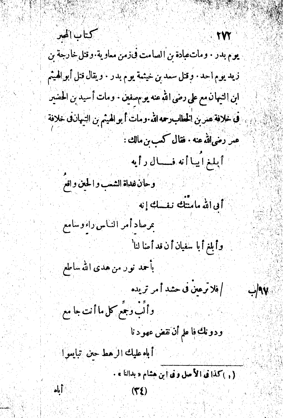 يوم بدر. ومات عبادة بن الصامت في زمن معاوية. وقتل خارجة بن زيد يوم احد. وقتل سعد بن خيثمة يوم بدر. ويقال قتل أبو الهيثم ابن التيهان مع علي رضي الله عنه يوم صفين. ومات أسيد بن الحضير في خلافة عمر بن الخطاب رحمه الله. ومات أبو الهيثم بن التيهان في خلافة عمر رضي الله عنه. فقال كعب بن مالك: