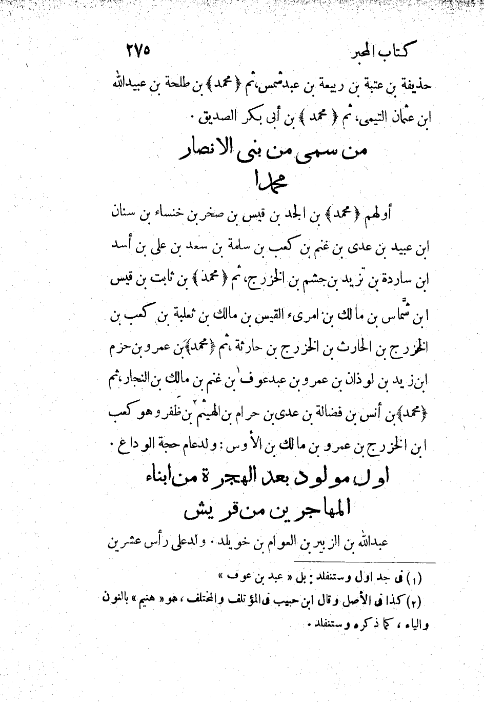 أولهم (محمد) بن الجد بن قيس بن صخر بن خنساء بن سنان ابن عبيد بن عدي بن غنم بن كعب بن سلمة بن سعد بن علي بن أسد ابن ساردة بن تزيد بن جشم بن الخزرج، ثم (محمد) بن ثابت بن قيس ابن شمّاس بن مالك بن امرئ القيس بن مالك بن ثعلبة بن كعب بن الخزرج بن الحارث بن الخزرج بن حارثة، ثم (محمد) بن عمرو بن حزم ابن زيد بن لوذان بن عمرو بن عبد عوف [1] بن غنم بن مالك بن النجار، ثم (محمد) بن أنس بن فضالة بن عدي بن حرام بن الهيثم [2] بن ظفر وهو كعب ابن الخزرج بن عمرو بن مالك بن الأوس: ولد عام حجة الوداع.