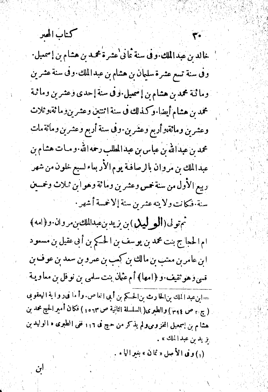 [ () ] ابن عبد الملك بن الحارث بن الحارث بن الحكم بن أبي العاص. وأما فى رواية اليعقوبي (ج 2 ص 394) والطبري (السلسلة الثانية ص 1563) فكان أمير الحج محمد بن هشام بن إسمعيل المخزومي ولم يذكر من حج فى 116 ففي الطبري «الوليد بن يزيد بن عبد الملك» .