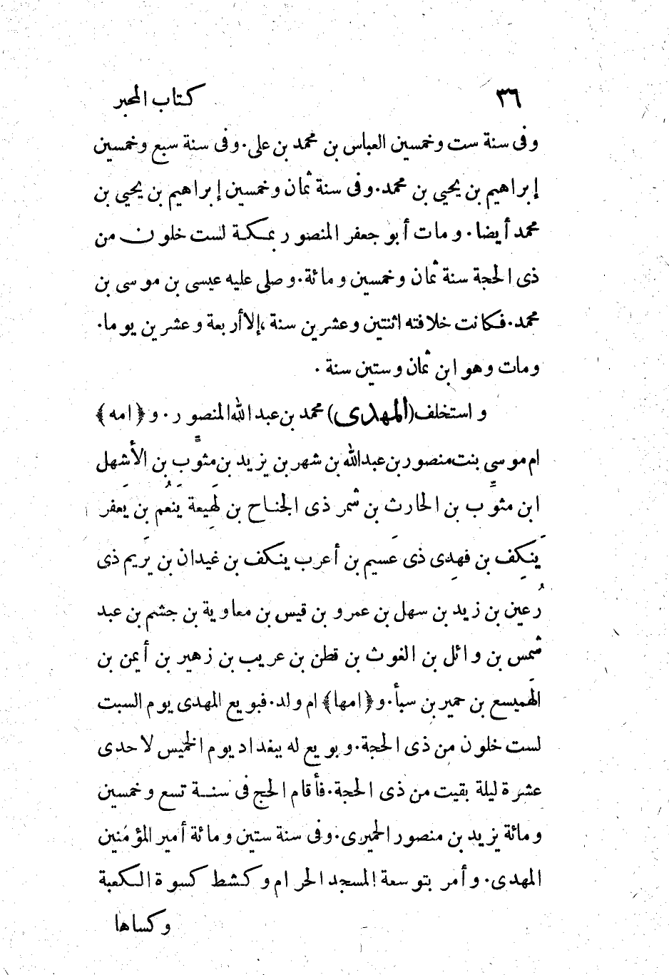 واستخلف (المهدي) محمد بن عبد الله المنصور. و (امه) ام موسى بنت منصور بن عبد الله بن شهر بن يزيد بن مثوّب بن الأشهل ابن مثوب بن الحارث بن شمر ذي الجناح بن لَهِيعة يَنُعم بن يَعفر يَنكف بن فهدِي ذي عَسيم بن أعرب ينكف بن غيدان بن يَريم ذي رُعين بن زيد بن سهل بن عمرو بن قيس بن معاوية بن جشم بن عبد شمس بن وائل بن الغوث بن قطن بن عريب بن زهير بن أيمن بن الهَميسع بن حمير بن سبأ. و (أمها) أم ولد. فبويع المهدي يوم السبت لست خلون من ذي الحجة. وبويع له ببغداد يوم الخميس لاحدى عشرة ليلة بقيت من ذي الحجة. فأقام الحج في سنة تسع وخمسين ومائة يزيد بن منصور الحميري. وفي سنة ستين ومائة أمير المؤمنين المهدي. وأمر بتوسعة المسجد الحرام وكشط كسوة الكعبة