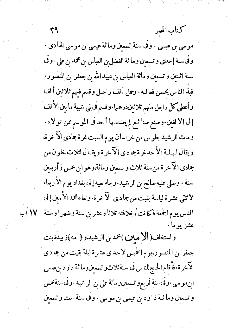 واستخلف (الأمين) محمد بن الرشيد، و (أمه) زبيدة بنت جعفر بن المنصور، يوم الخميس لاحدى عشرة ليلة بقيت من جمادى الآخرة. فأقام الحج للناس في سنة ثلاث وتسعين ومائة داود بن عيسى ابن موسي. وفي سنة أربع وتسعين ومائة علي بن الرشيد. وفي سنة خمس وتسعين ومائة داود بن عيسى بن موسي. وفي سنة ست وتسعين
