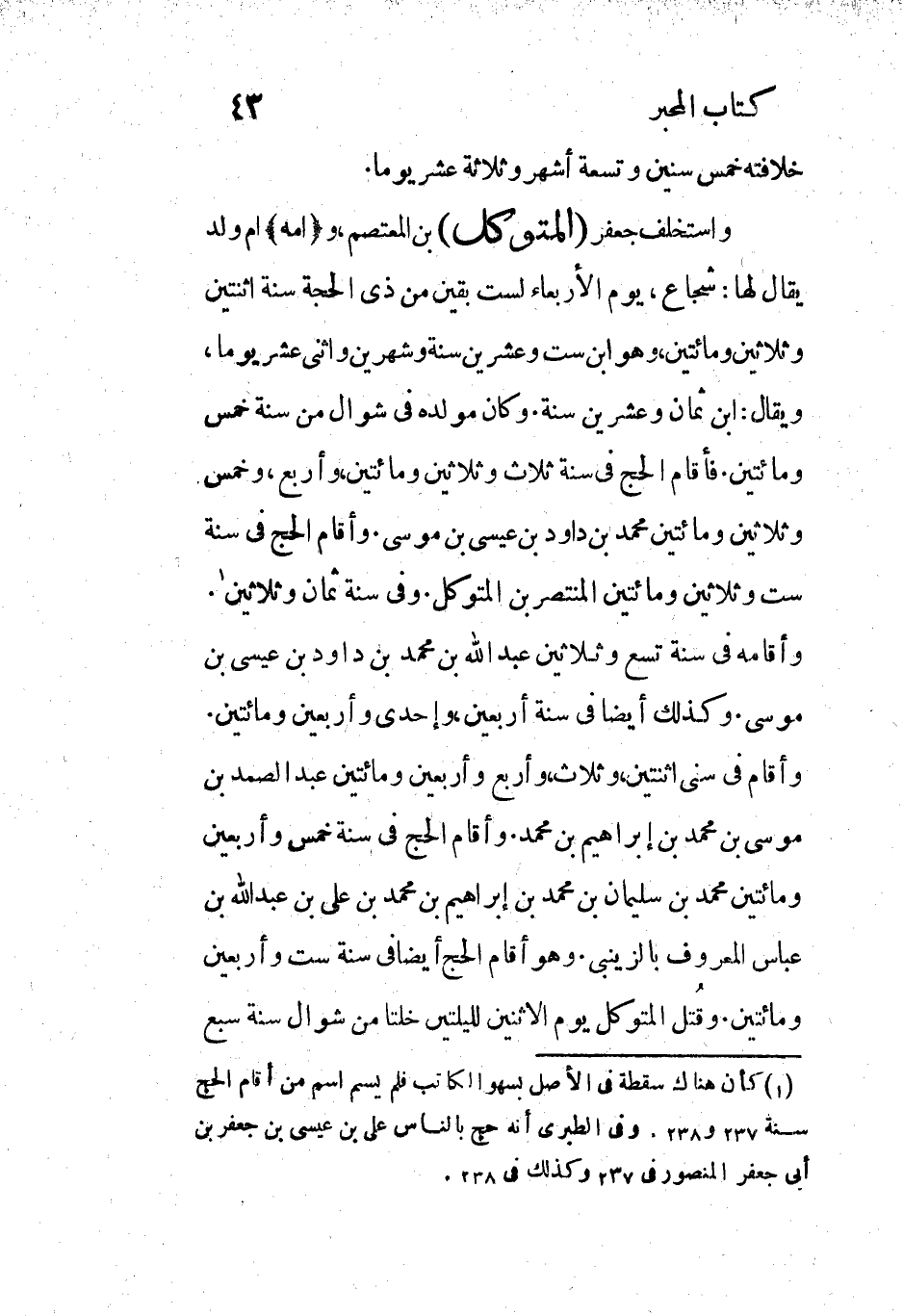 [1] كأن هناك سقطة فى الأصل بسهو الكاتب فلم يسم اسم من أقام الحج سنة 237 و 238. وفى الطبري أنه حج بالناس على بن عيسى بن جعفر بن أبى جعفر المنصور فى 237 وكذلك فى 238.