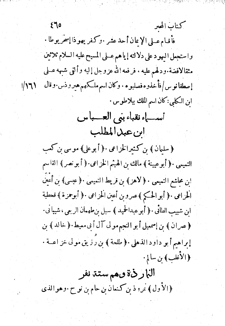 (سليمان) بن كثير الخزاعي. (أبو على) موسى بن كعب التميمي. (أبو عيينة) مالك بن الهيثم الخزاعي. (أبو نصر) القاسم ابن مجاشع التميمي. (لاهز) بن قريط التميمي. (عيسى) بن أعْينَ الخزاعي. (أبو الحكم) عمرو بن أعين الخزاعي. (أبو حمزة) قحطبة ابن شبيب الطائي. (أبو عبد الحميد) سبل بن طهمان الربعي، شيباني.