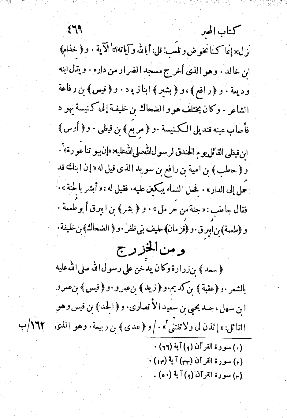(سعد) بن زرارة وكان يدِّخن على رسول الله صلى الله عليه بالشعر. و (عقبة) بن كديم. و (زيد) بن عمرو. و (قيس) بن عمرو ابن سهل، جد يحيى بن سعيد الأنصارى. و (الجد) بن قيس وهو القائل: «ائْذَنْ لِي وَلا تَفْتِنِّي 9: 49 [3] » . / و (عدى) بن ربيعة. وهو الذي
