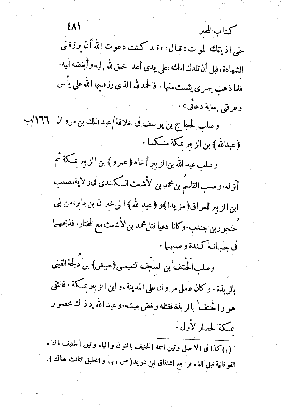 وصلب الحجاج بن يوسف في خلافة/ عبد الملك بن مروان (عبد الله) بن الزبير بمكة منكسا.