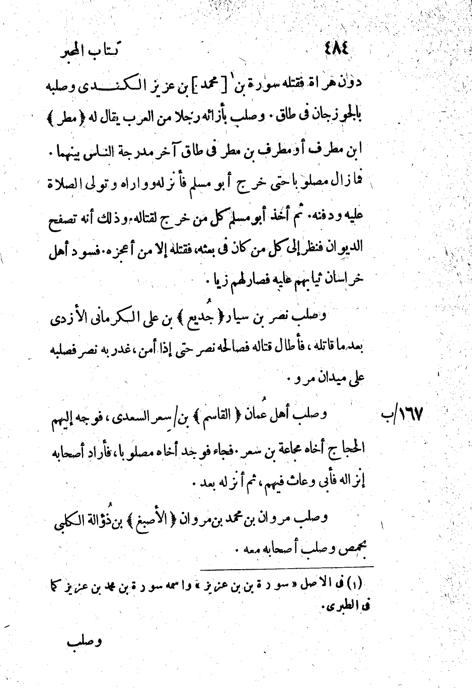دون هراة فقتله سورة بن [1] [محمد] بن عزيز الكندي وصلبه بالجوزجان في طاق. وصلب بإزائه رجلا من العرب يقال له (مطر) ابن مطرف أو مطرف بن مطر في طاق آخر مدرجة الناس بينهما.