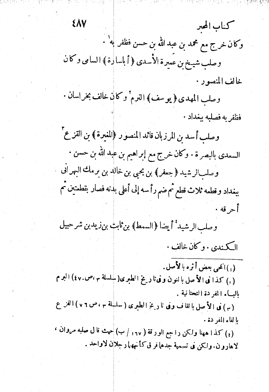 [4] كذا ههنا ولكن راجع الورقة (167/ ب) حيث قال صلبه مروان، لا هارون. ولكن فى تسمية جدهما فرق كأنهما رجلان لا واحد.