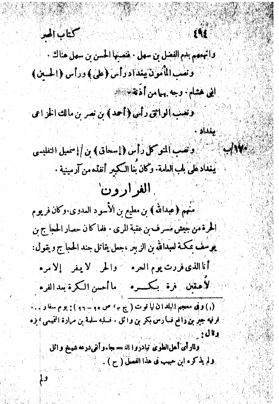 ونصب المأمون ببغداد رأس (علي) ورأس (الحسين) ابني هشام. وجه بهما من أذَنة.