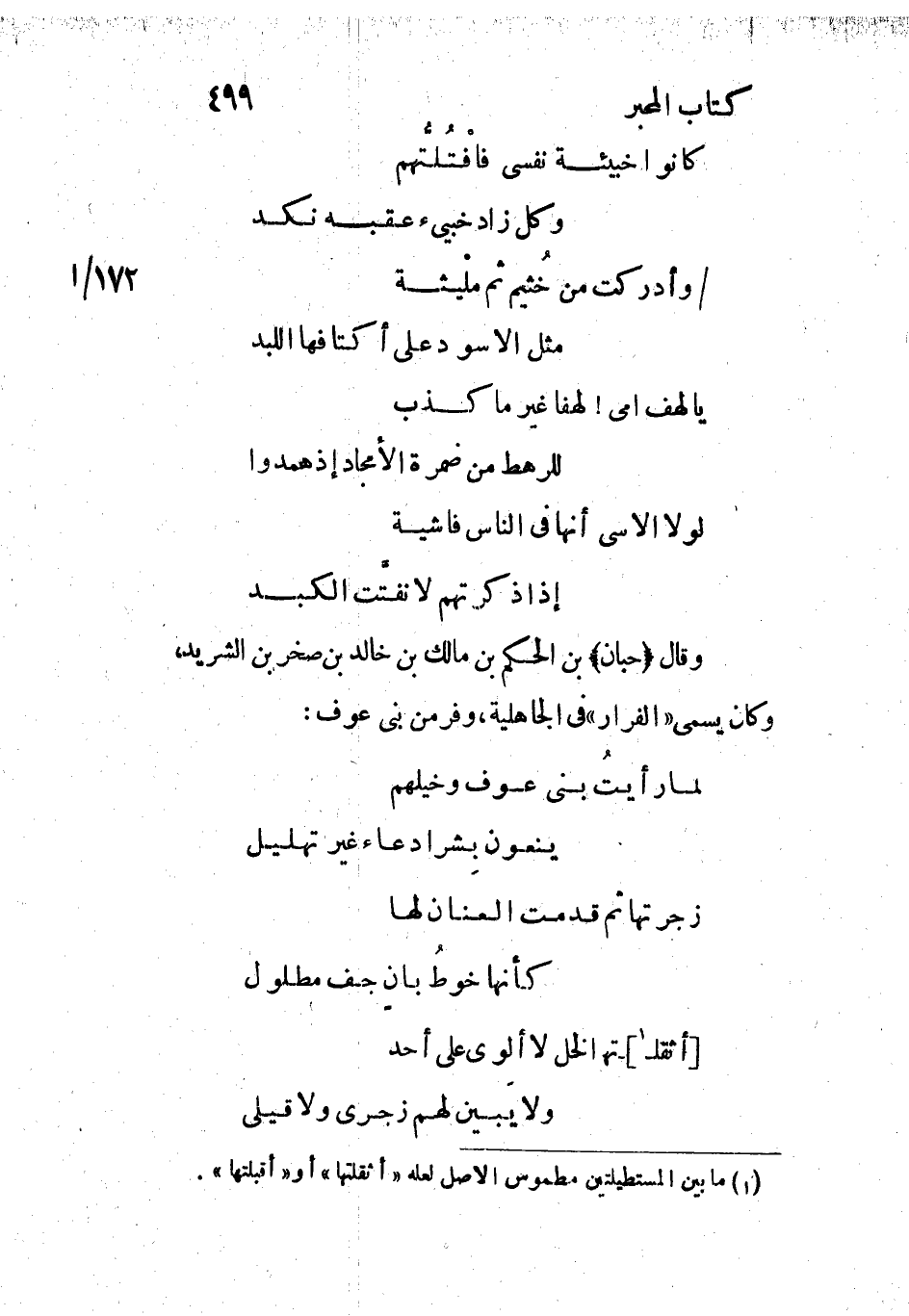 وقال (حبان) بن الحكم بن مالك بن خالد بن صخر بن الشريد، وكان يسمى «الفرار» في الجاهلية، وفر من بني عوف: