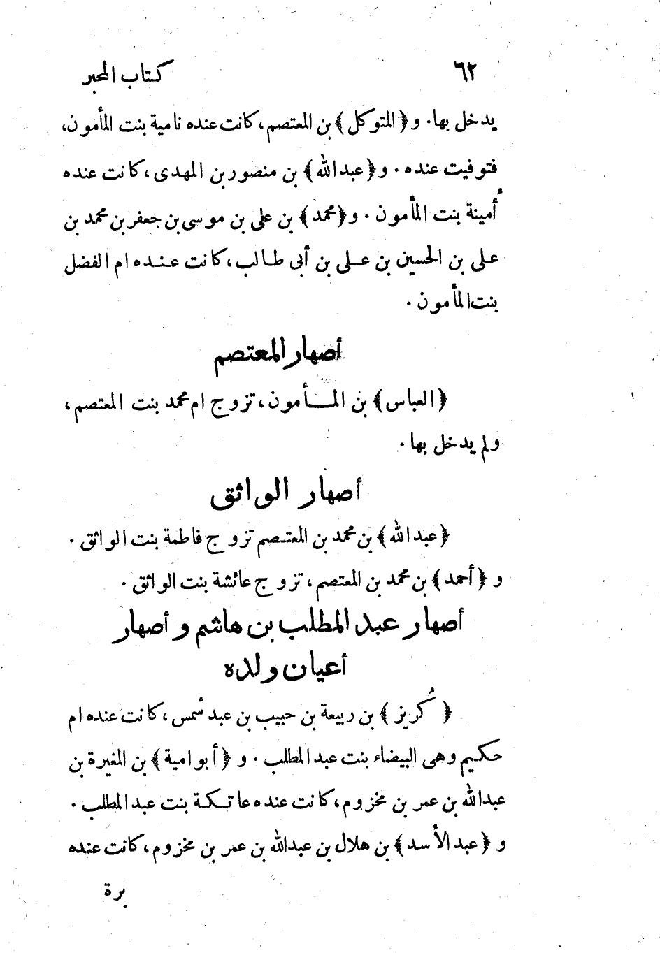 يدخل بها. و (المتوكل) بن المعتصم، كانت عنده نامية بنت المأمون، فتوفيت عنده. و (عبد الله) بن منصور بن المهدي، كانت عنده أمينة بنت المأمون. و (محمد) بن علي بن موسى بن جعفر بن محمد بن علي بن الحسين بن علي بن أبي طالب، كانت عنده أم الفضل بنت المأمون.