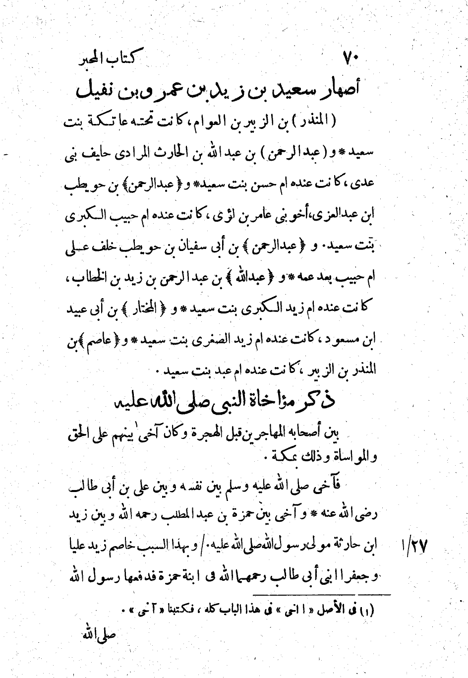 فآخى صلى الله عليه وسلم بين نفسه وبين علي بن أبي طالب رضي الله عنه وآخى بين حمزة بن عبد المطلب رحمه الله وبين زيد ابن حارثة مولى رسول الله صلى الله عليه. / وبهذا السبب خاصم زيد علياً وجعفراً ابني أبي طالب رحمهما الله في ابنة حمزة فدفعها رسول الله