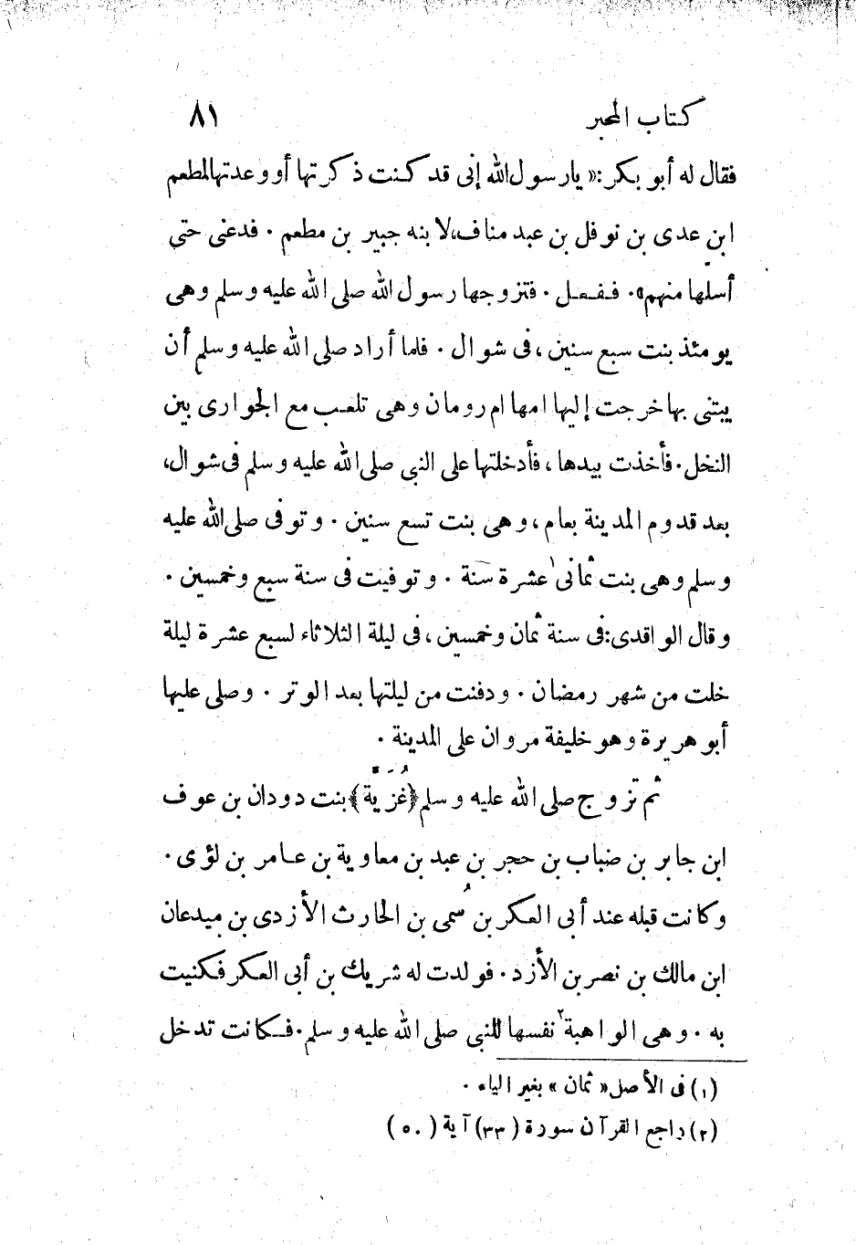 فقال له أبو بكر: «يا رسول الله إني قد كنت ذكرتها أو وعدتها لمطعم ابن عدي بن نوفل بن عبد مناف، لابنه جبير بن مطعم. فدعني حتى أسلّها منهم» . ففعل. فتزوجها رسول الله صلى الله عليه وسلم وهي يومئذ بنت سبع سنين، في شوال. فلما أراد صلى الله عليه وسلم أن يبتني بها خرجت إليها أمها أم رومان وهي تلعب مع الجواري بين النخل. فأخذت بيدها، فأدخلتها على النبي صلى الله عليه وسلم في شوال، بعد قدوم المدينة بعام، وهي بنت تسع سنين. وتوفي صلى الله عليه وسلم وهي بنت ثماني [1] عشرة سنة. وتوفيت في سنة سبع وخمسين.