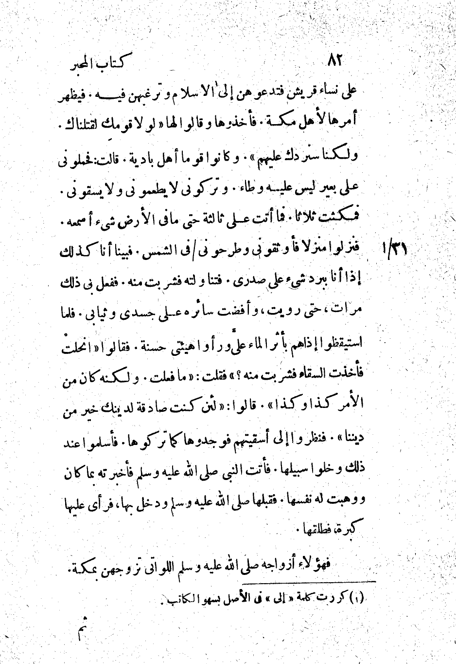 فنزلوا منزلا فأوثقونى وطرحوني/ فى الشمس. فبينا أنا كذلك إذا أنا ببرد شيء على صدري. فتناولته فشربت منه. ففعل بي ذلك مرات، حتى رويت، وأفضت سائره على جسدي وثيابي. فلما استيقظوا اذا هم باثر الماء علي ورأوا هيئتى حسنة. فقالوا «انحلت فأخذت السقاء فشربت منه؟» فقلت: «ما فعلت. ولكنه كان من الأمر كذا وكذا» . قالوا: «لئن كنت صادقة لدينك خير من ديننا» . فنظروا إلى أسقيتهم فوجدوها كما تركوها. فأسلموا عند ذلك وخلوا سبيلها. فأتت النبي صلى الله عليه وسلم فأخبرته بما كان ووهبت له نفسها. فقبلها صلى الله عليه وسلم ودخل بها، فرأى عليها كبرة، فطلقها.