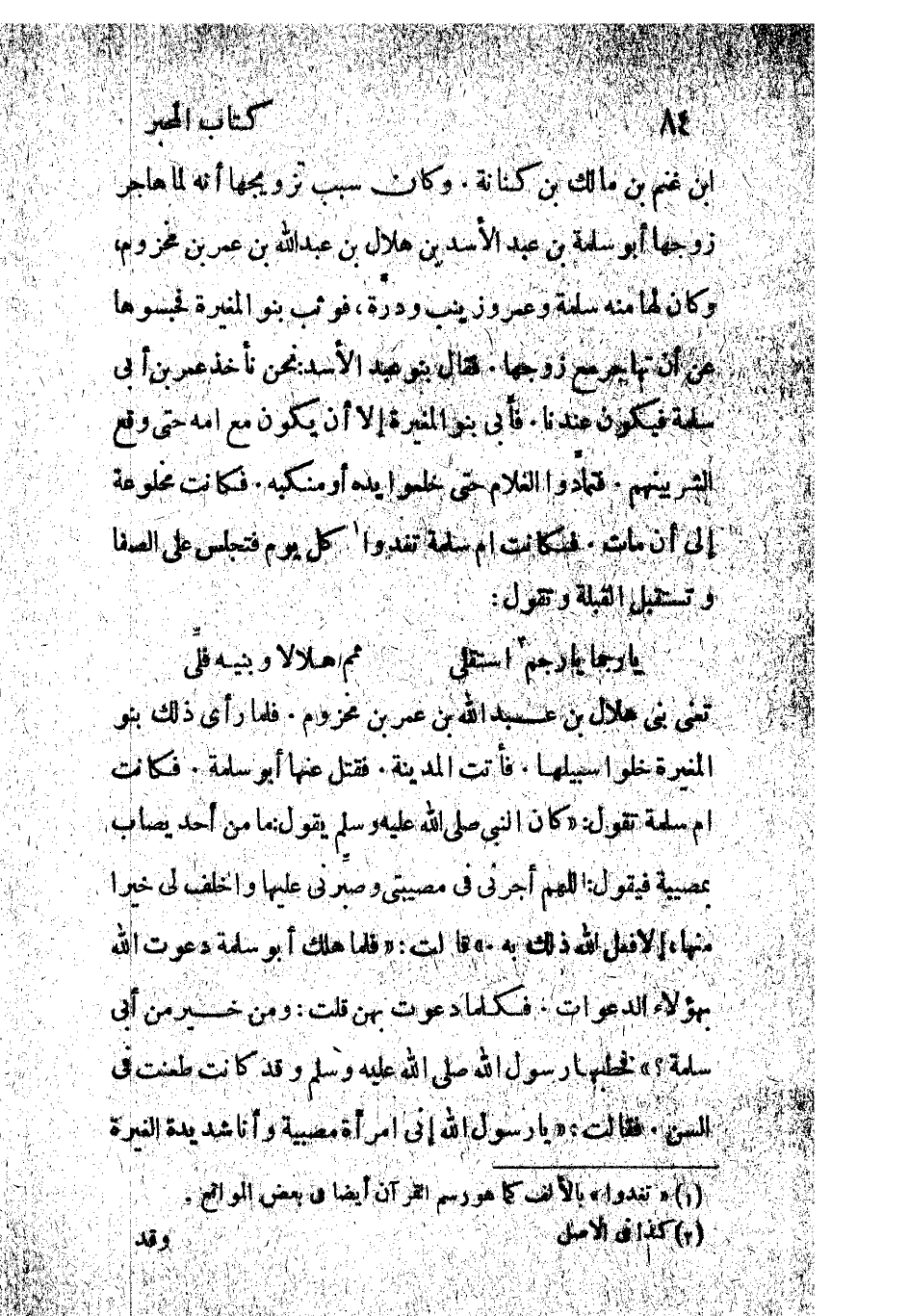 تعني بني هلال بن عبد الله بن عمر بن مخزوم. فلما رأى ذلك بنو المغيرة خلوا سبيلها. فأتت المدينة. فقتل عنها أبو سلمة. فكانت أم سلمة تقول: «كان النبي صلى الله عليه وسلم يقول: ما من أحد يصاب بمصيبة فيقول: اللهم أجرني في مصيبتي وصبرني عليها واخلف لي خيراً منها، إلا فعل الله ذلك به.» قالت: «فلما هلك أبو سلمة دعوت الله بهؤلاء الدعوات. فكلما دعوت بهن قلت: ومن خير من أبي سلمة؟» فخطبها رسول الله صلى الله عليه وسلم وقد كانت طعنت في السن. فقالت: «يا رسول الله إنى امرأة مصيبة وأنا شديدة الغيرة