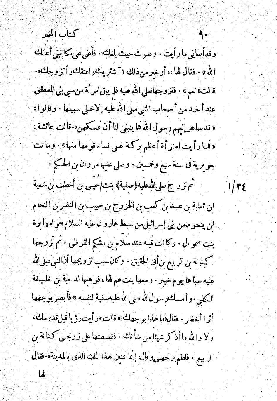 ثم تزوج صلى الله عليه (صفية) بنت/ حيي بن أخطب بن شعية ابن ثعلبة بن عبيد بن كعب بن الخزرج بن حبيب بن النضر بن النحام ابن ينحوم، من بني إسرائيل من سبط هارون عليه السلام وأمها برة بنت سموأل. وكانت قبله عند سلام بن مشكم القرظي. ثم تزوجها كنانة بن الربيع بن أبي الحقيق. وكان سبب تزويجها أن النبي صلى الله عليه سباها يوم خيبر. ومعها بنت عم لها، فوهبها لدحية بن خليفة الكلبي. وأمسك رسول الله صلى الله عليه صفية لنفسه فأبصر بوجهها أثرا أخضر. فقال «ما هذا بوجهك؟» قالت: «رأيت رؤيا قبل قدومك.