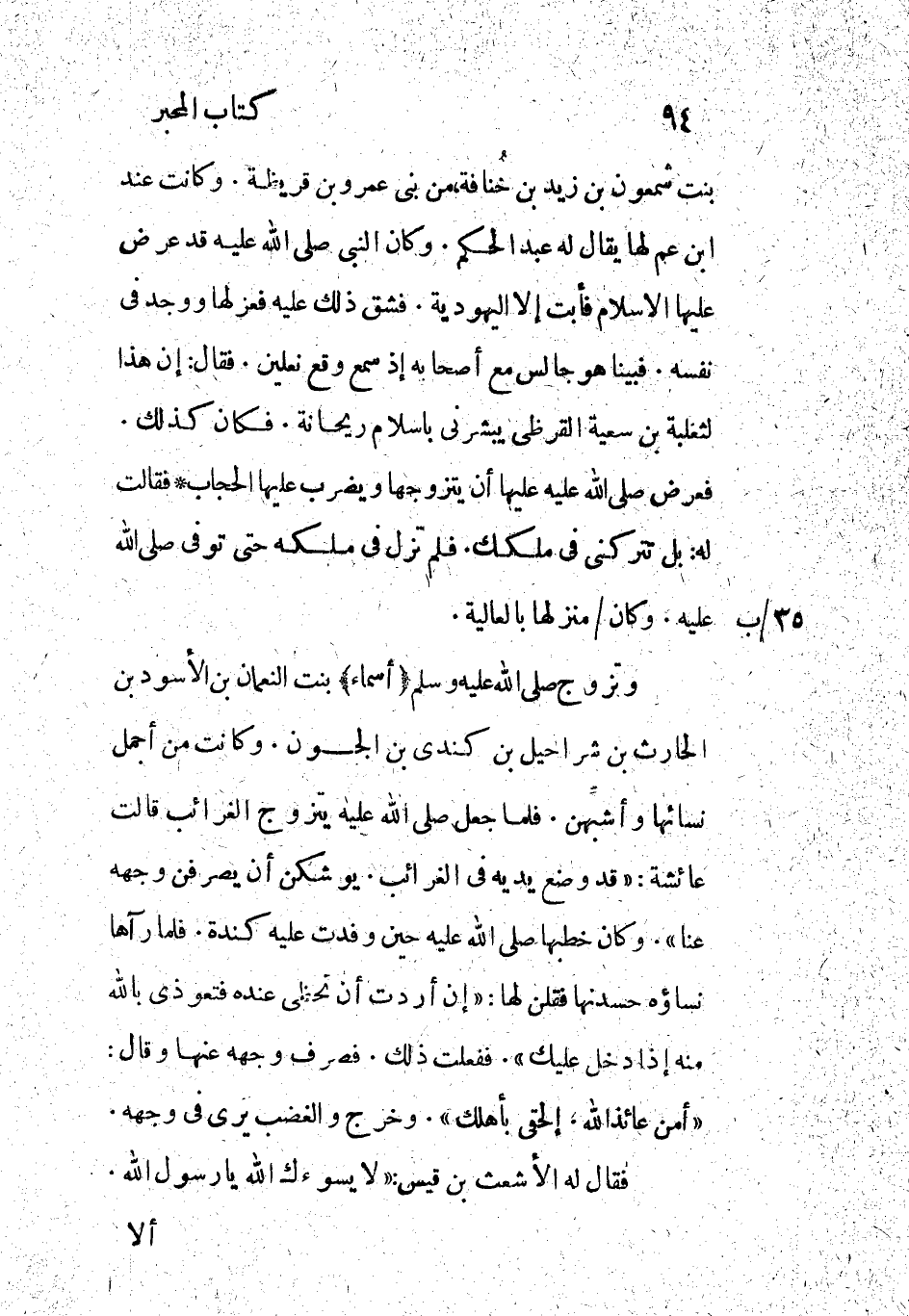 وتزوج صلى الله عليه وسلم (أسماء) بنت النعمان بن الأسود بن الحارث بن شراحيل بن كندى بن الجون. وكانت من أجمل نسائها وأشبهن. فلما جعل صلى الله عليه يتزوج الغرائب قالت عائشة: «قد وضع يديه في الغرائب. يوشكن أن يصرفن وجهه عنا» . وكان خطبها صلى الله عليه حين وفدت عليه كندة. فلما رآها نساؤه حسدنها فقلن لها: «إن أردت أن تحظي عنده فتعوذي بالله منه إذا دخل عليك» . ففعلت ذلك. فصرف وجهه عنها وقال: