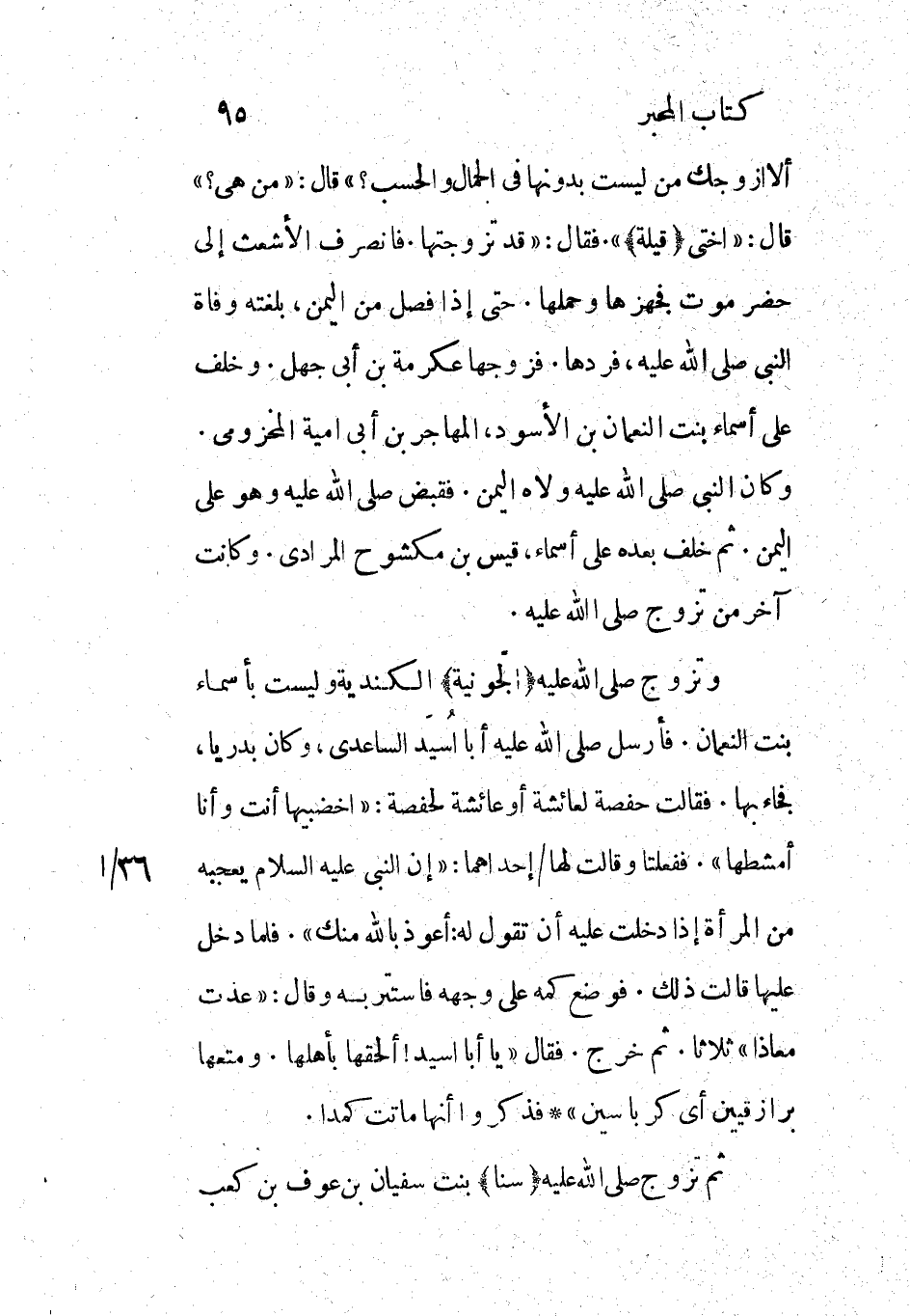 وتزوج صلى الله عليه (الجونية) الكندية وليست بأسماء بنت النعمان. فأرسل صلى الله عليه أبا أسيد الساعدي، وكان بدرياً، فجاء بها. فقالت حفصة لعائشة أو عائشة لحفصة: «أخضبيها أنت وأنا أمشطها» . ففعلتا وقالت لها/ إحداهما: «إن النبي عليه السلام يعجبه من المرأة إذا دخلت عليه أن تقول له: أعوذ بالله منك» . فلما دخل عليها قالت ذلك. فوضع كمه على وجهه فاستتر به وقال: «عدت معاذاً» ثلاثاً. ثم خرج. فقال «يا أبا أسيد! ألحقها بأهلها. ومتعها برازقيين أي كرباسين» فذكروا أنها ماتت كمدا.