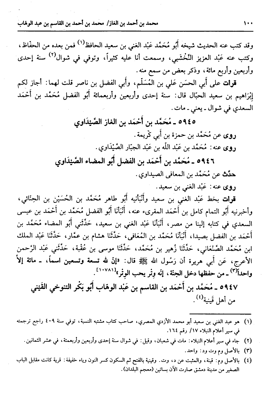 5946 - محمد بن أحمد بن الفضل أبو المضاء الصيداوي حدث عن محمد بن المعافى الصيداوي روى عنه عبد الغني بن سعيد قرأت بخط عبد الغني بن سعيد وأنبأنيه أبو طاهر محمد بن الحسين بن الحنائي وأخبرنيه أبو التمام كامل بن أحمد المقرئ عنه أنبأنا أبو الفضل محمد بن أحمد بن عيسى السعدي في كتابه إلينا من مصر أنبأنا عبد الغني بن سعيد حدثني أبو المضاء محمد بن أحمد بن الفضل بصيدا أنبأنا محمد بن المعافى حدثنا هشام بن عمار حدثنا عبد الملك ابن محمد الصنعاني حدثنا زهير بن محمد حدثنا موسى بن عقبة حدثني عبد الرحمن الأعرج عن أبي هريرة أن رسول الله (صلى الله عليه وسلم) قال إن لله تسعة وتسعين اسما مائة إلا واحدا (3) من حفظها دخل الجنة إنه وتر يحب الوتر