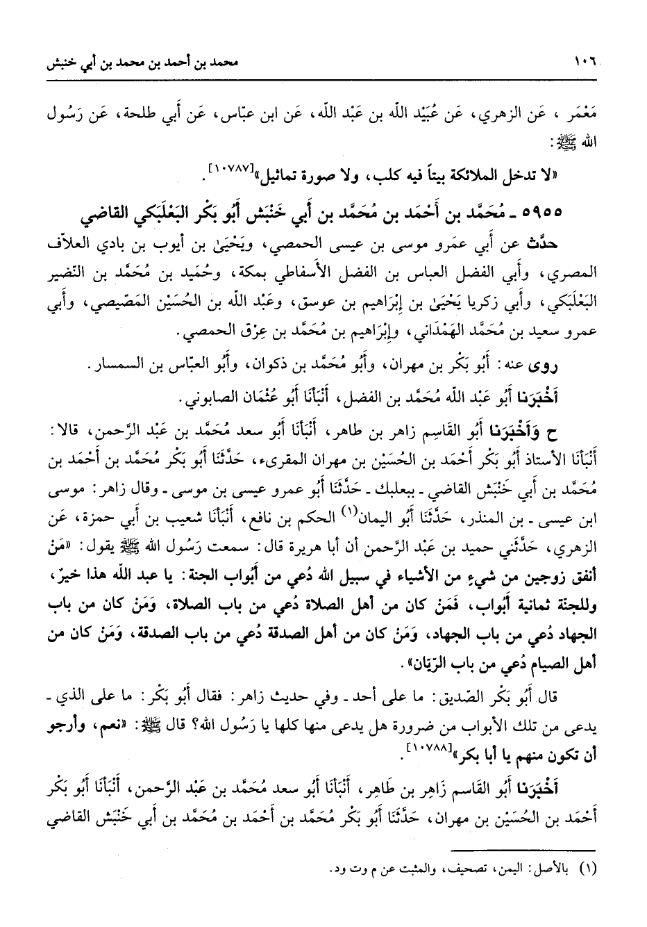 5955 - محمد بن أحمد بن محمد بن أبي خنبش أبو بكر البعلبكي القاضي حدث عن أبي عمرو موسى بن عيسى الحمصي ويحيى بن أيوب بن بادي العلاف المصري وأبي الفضل العباس بن الفضل الأسفاطي بمكة وحميد بن محمد بن النضير البعلبكي وأبي زكريا يحيى بن إبراهيم بن عوسق وعبد الله بن الحسين المصيصي وأبي عمرو سعيد بن محمد الهمداني وإبراهيم بن محمد بن عرق الحمصي روى عنه أبو بكر بن مهران وأبو محمد بن ذكوان وأبو العباس بن السمسار أخبرنا أبو عبد الله محمد بن الفضل أنبأنا أبو عثمان الصابوني ح وأخبرنا أبو القاسم زاهر بن طاهر أنبأنا أبو سعد محمد بن عبد الرحمن قالا أنبأنا الأستاذ أبو بكر أحمد بن الحسين بن مهران المقرئ حدثنا أبو بكر محمد بن أحمد بن محمد بن أبي خنبش القاضي ببعلبك حدثنا أبو عمرو عيسى بن موسى وقال زاهر موسى ابن عيسى بن المنذر حدثنا أبو اليمان (1) الحكم بن نافع أنبأنا شعيب بن أبي حمزة عن الزهري حدثني حميد بن عبد الرحمن أن أبا هريرة قال سمعت رسول الله (صلى الله عليه وسلم) يقول من أنفق زوجين من شئ من الأشياء في سبيل الله دعي من أبواب الجنة يا عبد الله هذا خير وللجنة ثمانية أبواب فمن كان من أهل الصلاة دعي من باب الصلاة ومن كان من باب الجهاد دعي من باب الجهاد ومن كان من أهل الصدقة دعي من باب الصدقة ومن كان من أهل الصيام دعي من باب الريان قال أبو بكر الصديق ما على أحد وفي حديث زاهر فقال أبو بكر ما على الذي يدعى من تلك الأبواب من ضرورة هل يدعى منها كلها يا رسول الله قال (صلى الله عليه وسلم) نعم وأرجو أن تكون منهم يا أبا بكر