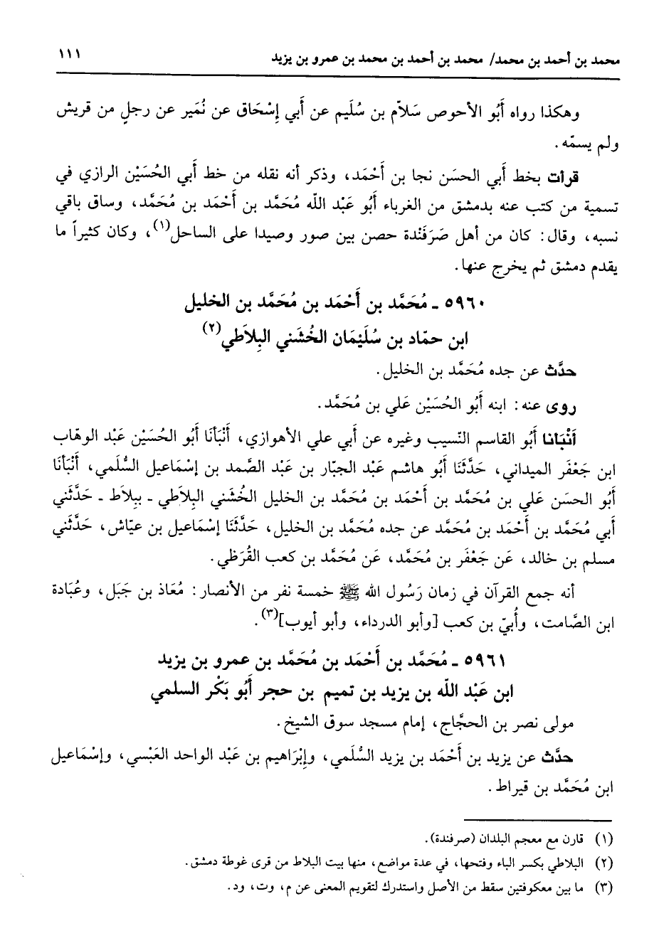 5960 - محمد بن أحمد بن محمد بن الخليل ابن حماد بن سليمان الخشني البلاطي (2) حدث عن جده محمد بن الخليل روى عنه ابنه أبو الحسين علي بن محمد أنبأنا أبو القاسم النسيب وغيره عن أبي علي الأهوازي أنبأنا أبو الحسين عبد الوهاب ابن جعفر الميداني حدثنا أبو هاشم عبد الجبار بن عبد الصمد بن إسماعيل السلمي أنبانا أبو الحسن علي بن محمد بن أحمد بن محمد بن الخليل الخشني البلاطي ببلاط حدثني أبي محمد بن أحمد بن محمد عن جده محمد بن الخليل حدثنا إسماعيل بن عياش حدثني مسلم بن خالد عن جعفر بن محمد عن محمد بن كعب القرظي أنه جمع القرآن في زمان رسول الله (صلى الله عليه وسلم) خمسة نفر من الأنصار معاذ بن جبل وعبادة بن الصامت وأبي بن كعب وأبو الدرداء وأبو أيوب (3)