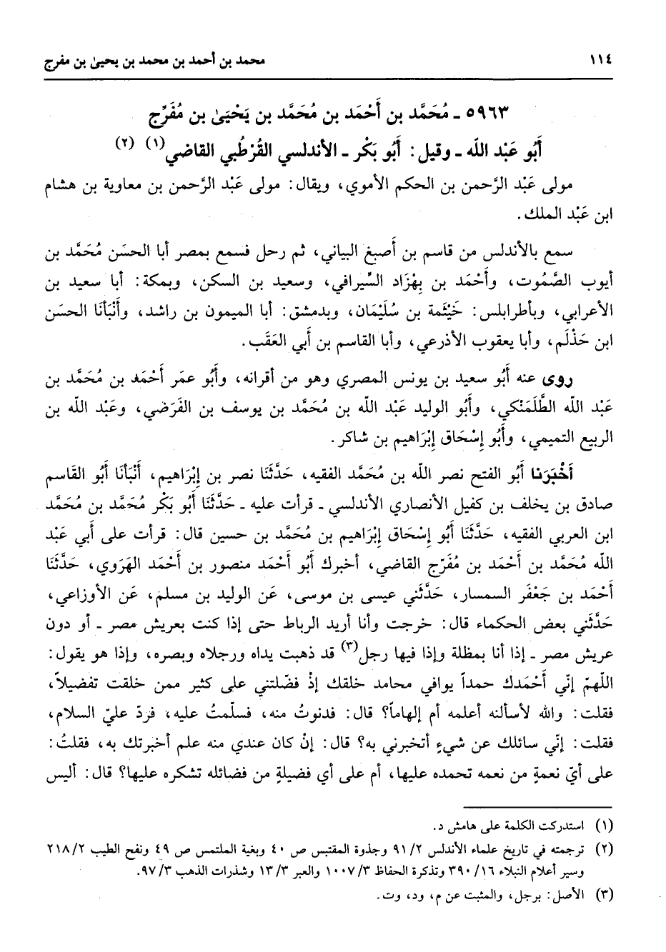(2) ترجمته في تاريخ علماء الاندلس 2 / 91 وجذوة المقتبس ص / 40 وبغية الملتمس ص 49 ونفح الطيب 2 / 218 وسير اعلام النبلاء 16 / 390 وتذكرة الحفاظ 3 / 1007 والعبر 3 / 13 وشذرات الذهب 3 / 97