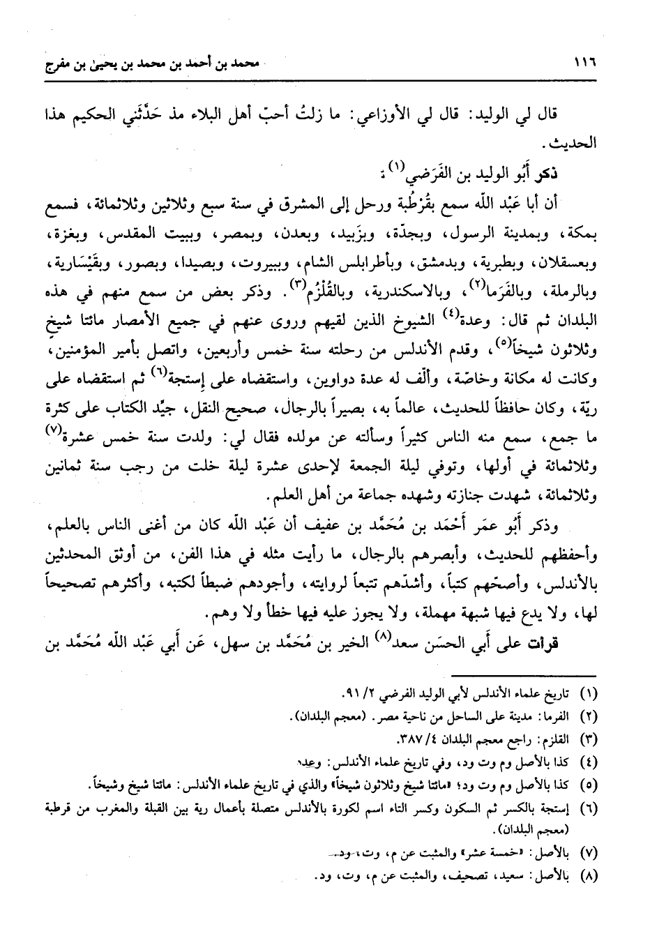 قال لي الوليد قال لي الأوزاعي ما زلت أحب أهل البلاء مذ حدثني الحكيم هذا الحديث ذكر أبو الوليد بن الفرضي (1) أن أبا عبد الله سمع بقرطبة ورحل إلى المشرق في سنة سبع وثلاثين وثلاثمائة فسمع بمكة وبمدينة الرسول وبجدة وبزبيد وبعدن وبمصر وببيت المقدس وبغزة وبعسقلان وبطبرية وبدمشق وبأطرابلس الشام وببيروت وبصيدا وبصور وبقيسارية وبالرملة وبالفرما (2) وبالإسكندرية وبالقلزم (3) وذكر بعض من سمع منهم في هذه البلدان ثم قال وعدة (4) الشيوخ الذين لقيهم وروى عنهم في جميع الأمصار مائتا شيخ وثلاثون شيخا (5) وقدم الأندلس من رحلته سنة خمس وأربعين واتصل بأمير المؤمنين وكانت له مكانة وخاصة وألف له عدة دواوين واستقضاه على إستجة (6) ثم استقضاه على رية وكان حافظا للحديث عالما به بصيرا بالرجال صحيح النقل جيد الكتاب على كثرة ما جمع سمع منه الناس كثيرا وسألته عن مولده فقال لي ولدت سنة خمس عشرة (7) وثلاثمائة في أولها وتوفي ليلة الجمعة لإحدى عشرة ليلة خلت من رجب سنة ثمانين وثلاثمائة شهدت جنازته وشهده جماعة من أهل العلم وذكر أبو عمر أحمد بن محمد بن عفيف أن عبد الله كان من أغنى الناس بالعلم وأحفظهم للحديث وأبصرهم بالرجال ما رأيت مثله في هذا الفن من أوثق المحدثين بالأندلس وأصحهم كتبا وأشدهم تتبعا لروايته وأجودهم ضبطا لكتبه وأكثرهم تصحيحا لها ولا يدع فيها شبهة مهملة ولا يجوز عليه فيها خطأ ولا وهم قرأت على أبي الحسن سعد (8) الخير بن محمد بن سهل عن أبي عبد الله محمد بن