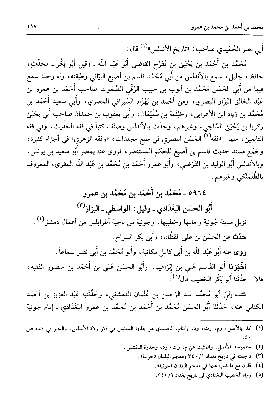 5964 - محمد بن أحمد بن محمد بن عمرو أبو الحسن البغدادي وقيل الواسطي البزاز (3) نزيل مدينة جونية وإمامها وخطيبها وجونية من ناحية أطرابلس من أعمال دمشق (4) حدث عن الحسن بن علي القطان وأبي بكر السراج روى عنه أبو عبد الله بن أبي كامل مكاتبة وأبو محمد بن أبي نصر سماعا أخبرنا أبو القاسم علي بن إبراهيم وابو الحسن علي بن أحمد بن منصور الفقيه قالا حدثنا أبو بكر الخطيب قال (5) كتب إلي أبو محمد عبد الرحمن بن عثمان الدمشقي وحدثنيه عبد العزيز بن أحمد الكتاني عنه حدثنا أبو الحسن محمد بن أحمد بن محمد بن عمرو البغدادي إمام جونية