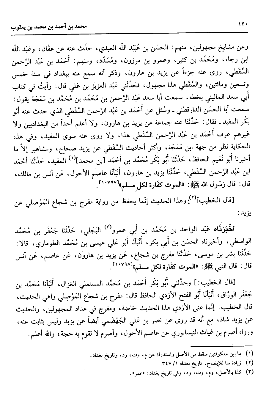 وعن مشايخ مجهولين منهم الحسن بن عبيد الله العبدي حدث عنه عن عفان وعبد الله بن رجاء ومحمد بن كثير وعمرو بن مرزون ومسدد ومنهم أحمد بن عبد الرحمن السقطي روى عنه جزءا عن يزيد بن هارون وذكر أنه سمع منه ببغداد في سنة خمس وتسعين ومائتين والسقطي هذا مجهول فحدثني عبد العزيز بن علي قال رأيت في كتاب أبي سعد الماليني بخطه سمعت أبا سعد عبد الرحمن بن محمد بن محمد بن ممجة يقول سمعت أبا الحسن الدارقطني وسئل عن أحمد بن عبد الرحمن السقطي الذي حدث عنه أبو بكر المفيد فقال حدثنا عنه جماعة عن يزيد بن هارون ولا أعلم أحدا من البغداديين ولا غيرهم عرف أحمد بن عبد الرحمن السقطي هذا ولا روى عنه سوى المفيد وفي هذه الحكاية نظر من جهة ابن ممجة وأكثر أحاديث السقطي عن يزيد صحاح ومشاهير إلا ما أخبرنا أبو نعيم الحافظ حدثنا أبو بكر محمد بن أحمد بن محمد (1) المفيد حدثنا أحمد ابن عبد الرحمن السقطي حدثنا يزيد بن هارون أنبأنا عاصم الأحول عن أنس بن مالك قال قال رسول الله (صلى الله عليه وسلم) الموت كفارة لكل مسلم